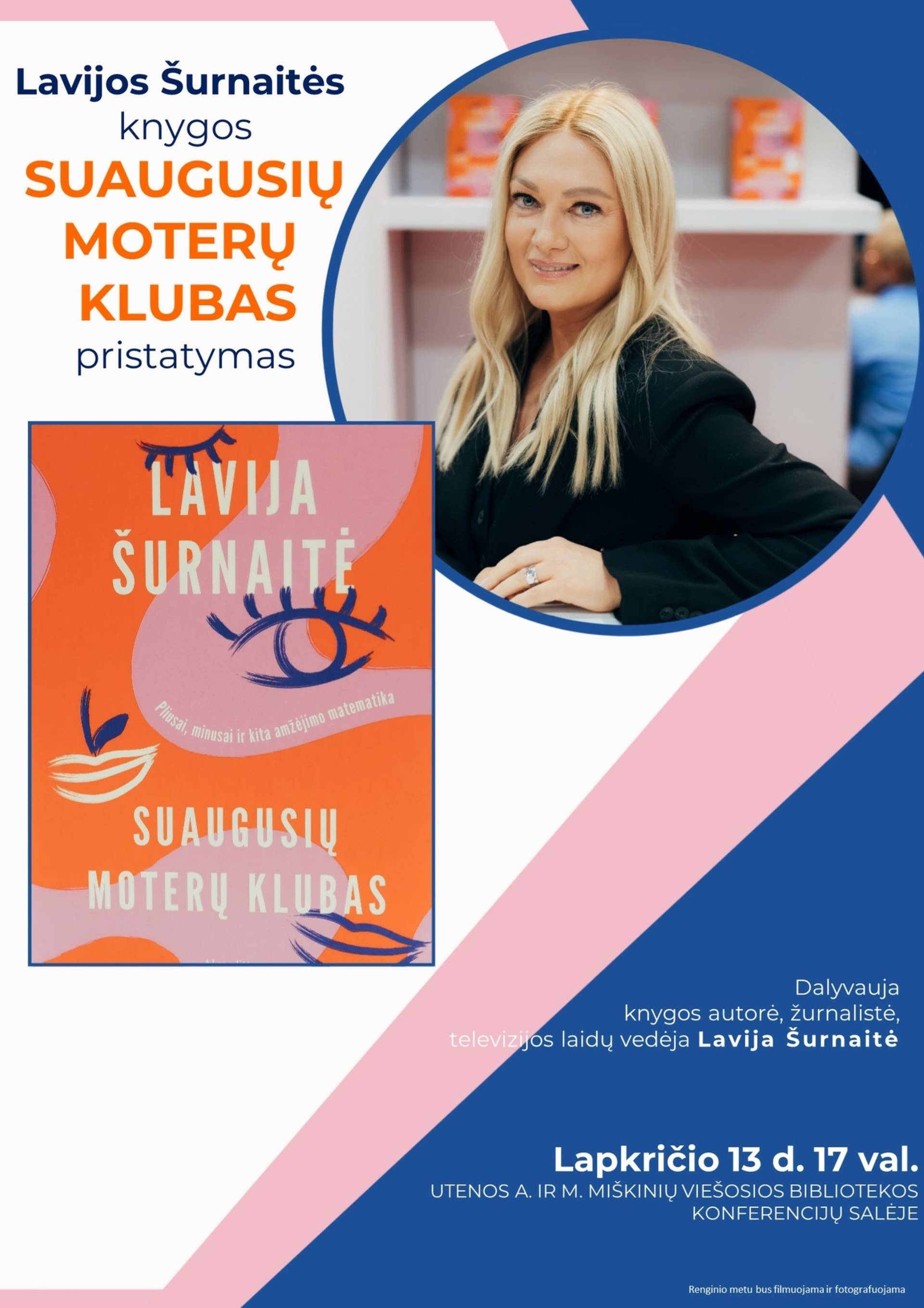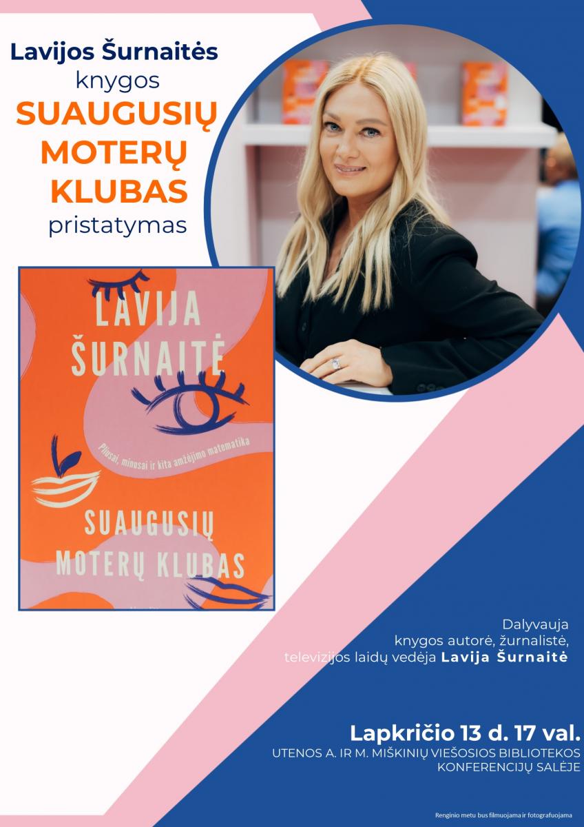 2025 m. lapkričio 13 d. 17 val. Utenos A. ir M. Miškinių viešosios bibliotekos konferencijų salėje Lavijos Šurnaitės knygos „Suaugusių moterų klubas“ pristatymas.