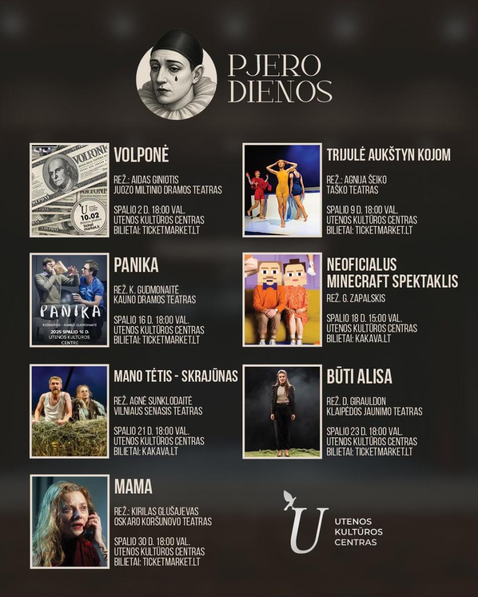 Utenos kultūros centre spalio mėnesį vyksiančios „Pjero dienos“ kviečia žiūrovus pasinerti į teatro pasaulį. Festivalio programoje – ryškūs Lietuvos teatrų spektakliai, suburiantys tiek pripažintus režisierius, tiek talentingus aktorius. Kiekvienas vakaras taps unikaliu susitikimu su įvairių žanrų scenos kūriniais.