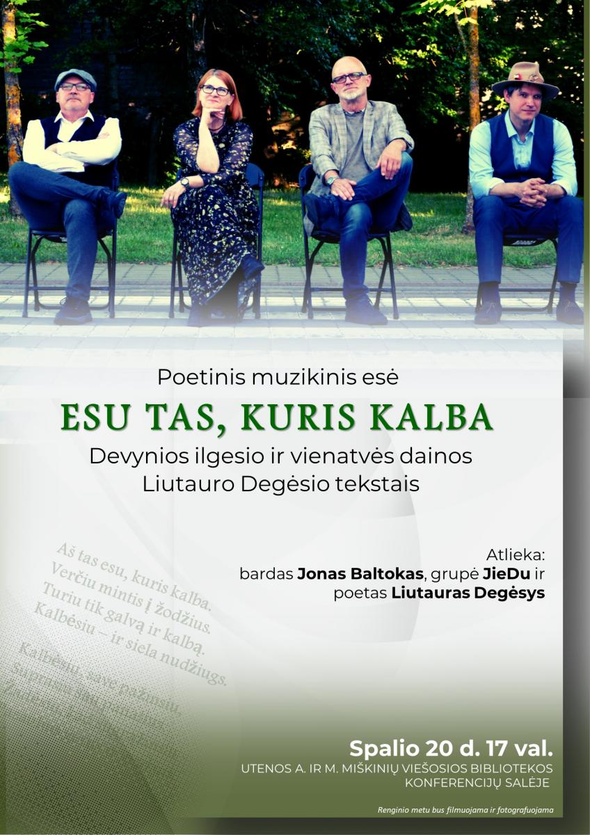 Atlieka: bardas Jonas Baltokas, grupė JieDu ir poetas Liutauras Degėsys.
