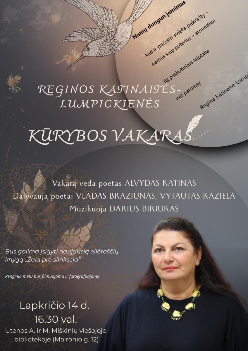 2025 m. lapkričio 14 d. 16.30 val. Utenos A. ir M. Miškinių viešosios bibliotekos konferencijų salėje Reginos Katinaitės-Lumpickienės KŪRYBOS VAKARAS. Vakarą veda poetas ALVYDAS KATINAS. Dalyvauja poetai VLADAS BRAZIŪNAS, VYTAUTAS KAZIELA. Muzikuoja DARIUS BIRIUKAS.