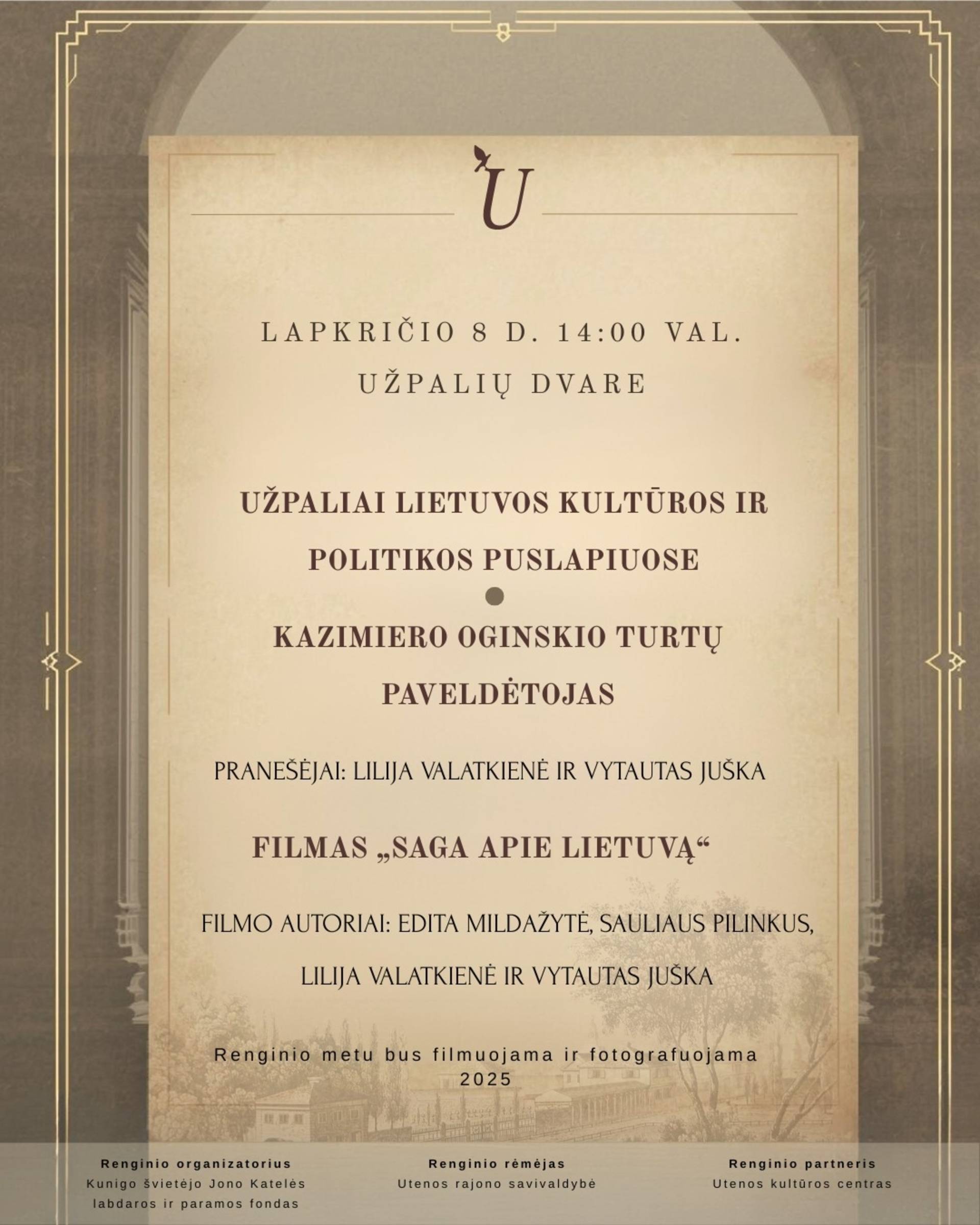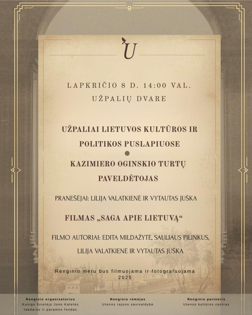 Baigiantis jubiliejiniams Mykolo Kleopo Oginskio metams, lapkričio 8 d. 14:00 val. Jūsų laukia dar vienas intriguojantis susitikimas su Mykolu Kazimieru Oginskiu. Susitikime Lilija Valatkienė kartu su Vytautu Juška skaitys pranešimus „UŽPALIAI LIETUVOS KULTŪROS IR POLITIKOS PUSLAPIUOSE“ ir „KAZIMIERO OGINSKIO TURTŲ PAVELDĖTOJAS, DIPLOMATAS, POLITIKAS, KOMPOZITORIUS“.